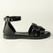 A refined sandal with a modern edge, designed in a glossy black finish. Its wide woven straps at the front create a bold statement, while the ankle strap with buckle fastening ensures a secure and stylish fit. Minimal yet sophisticated, this sandal balances comfort and polish, making it perfect for both casual and dressed-up occasions.